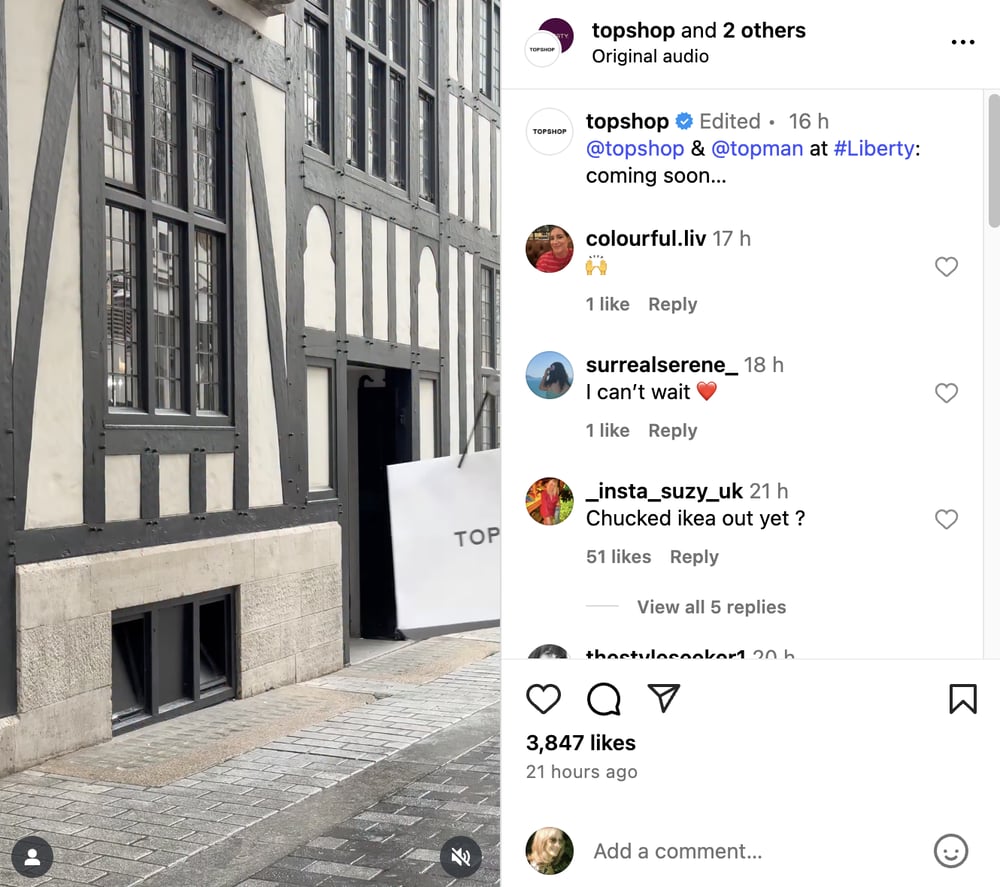 It’s high-end London department store Liberty. Not that the company released this news officially at first. Instead, an Instagram post shows a rail of Topshop clothing being wheeled along with a glimpse of a mock-Tudor building and a W1 postcode in the background. This could be no other store than Liberty, just off London’s Regent Street.